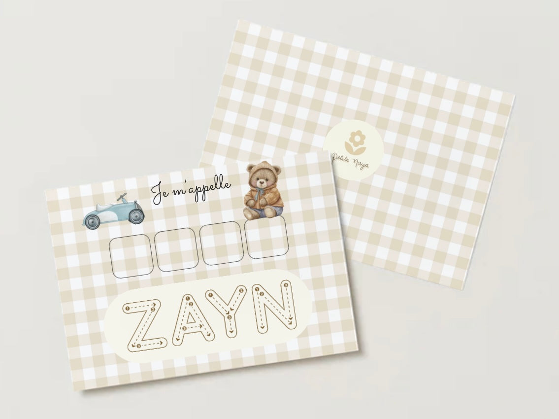 - Format A4 imprimé et plastifié + vignettes prénoms plastifiés et scratchs pour les repositionner ainsi qu’un feutre effaçable.