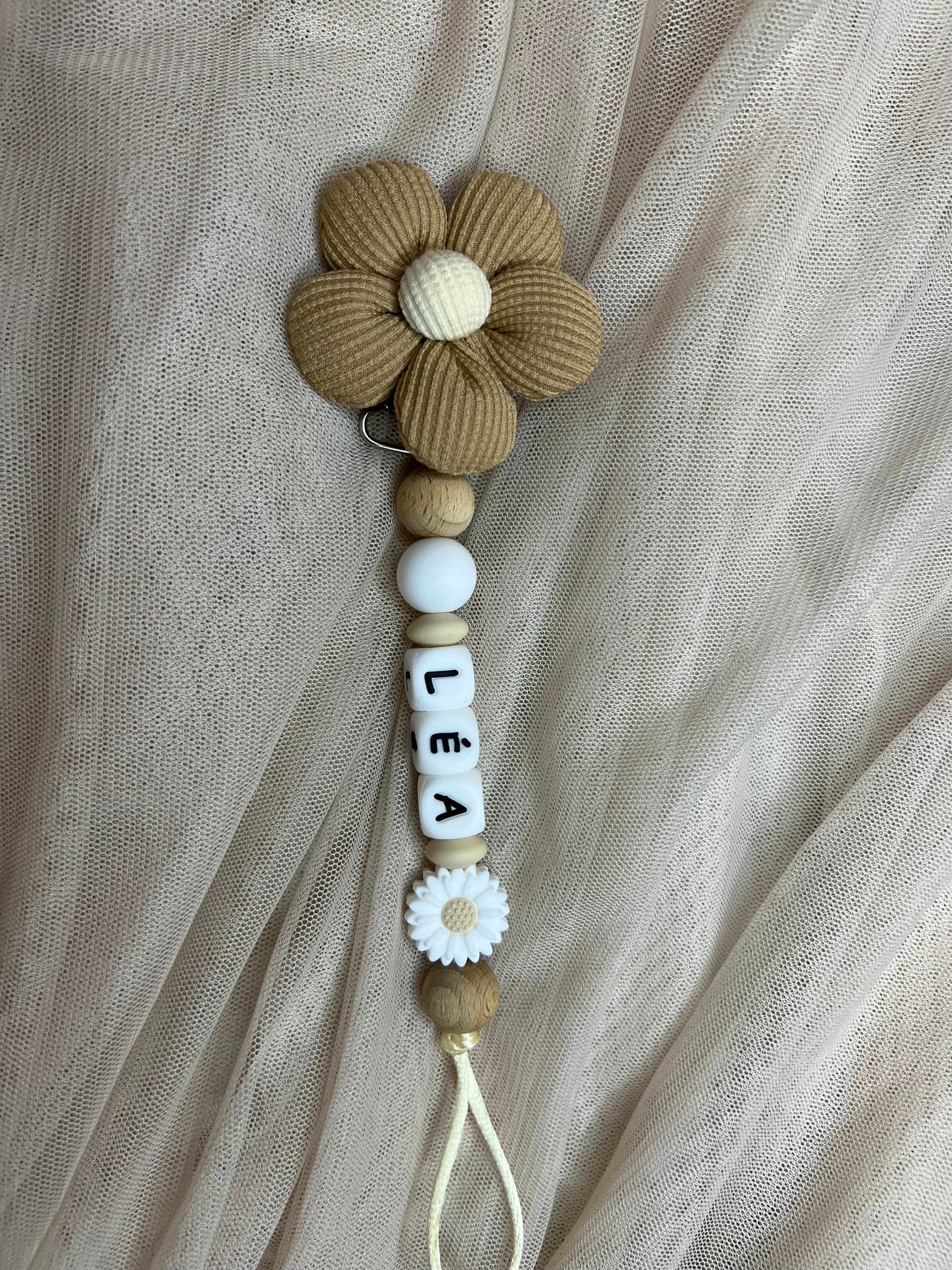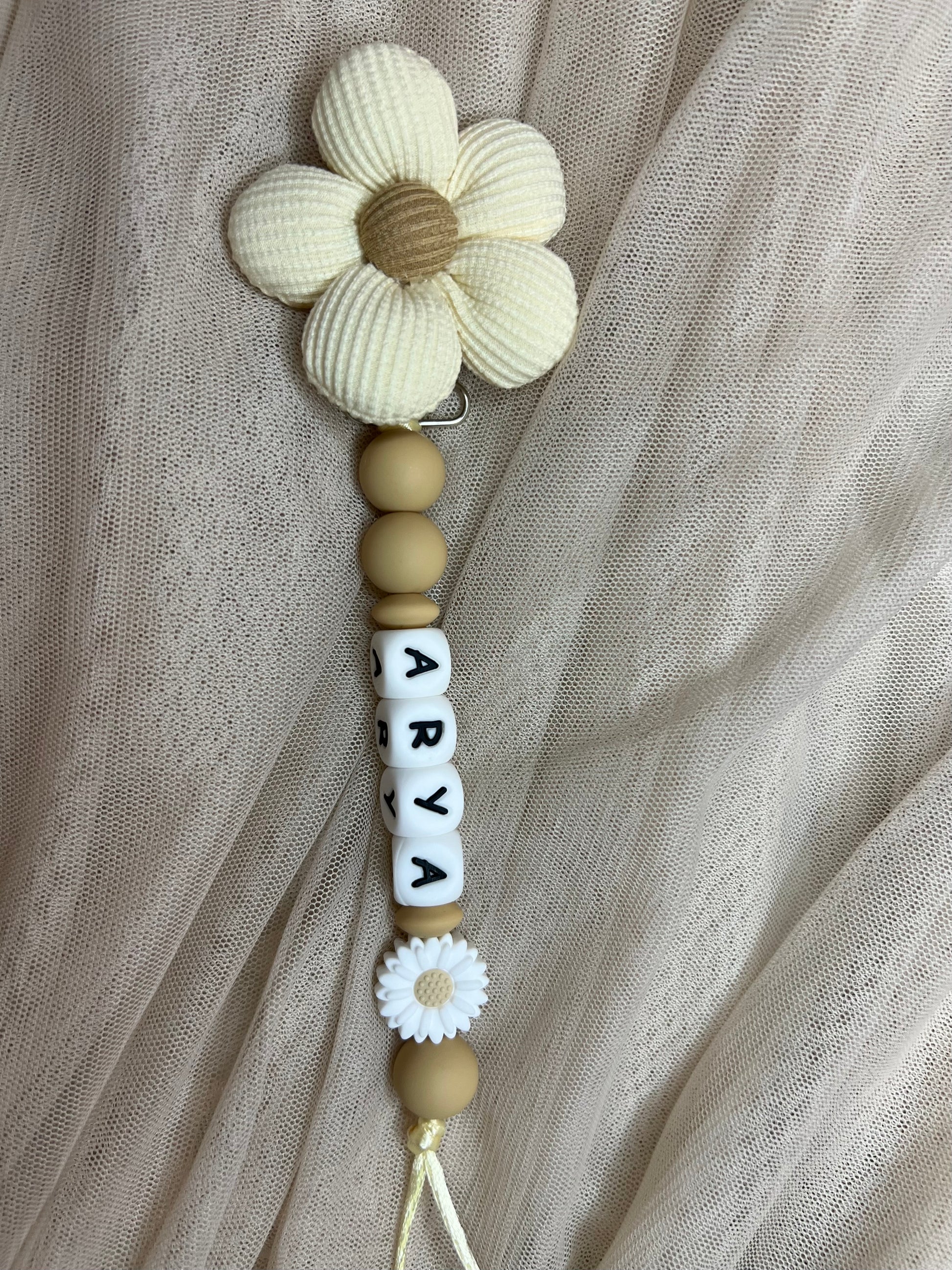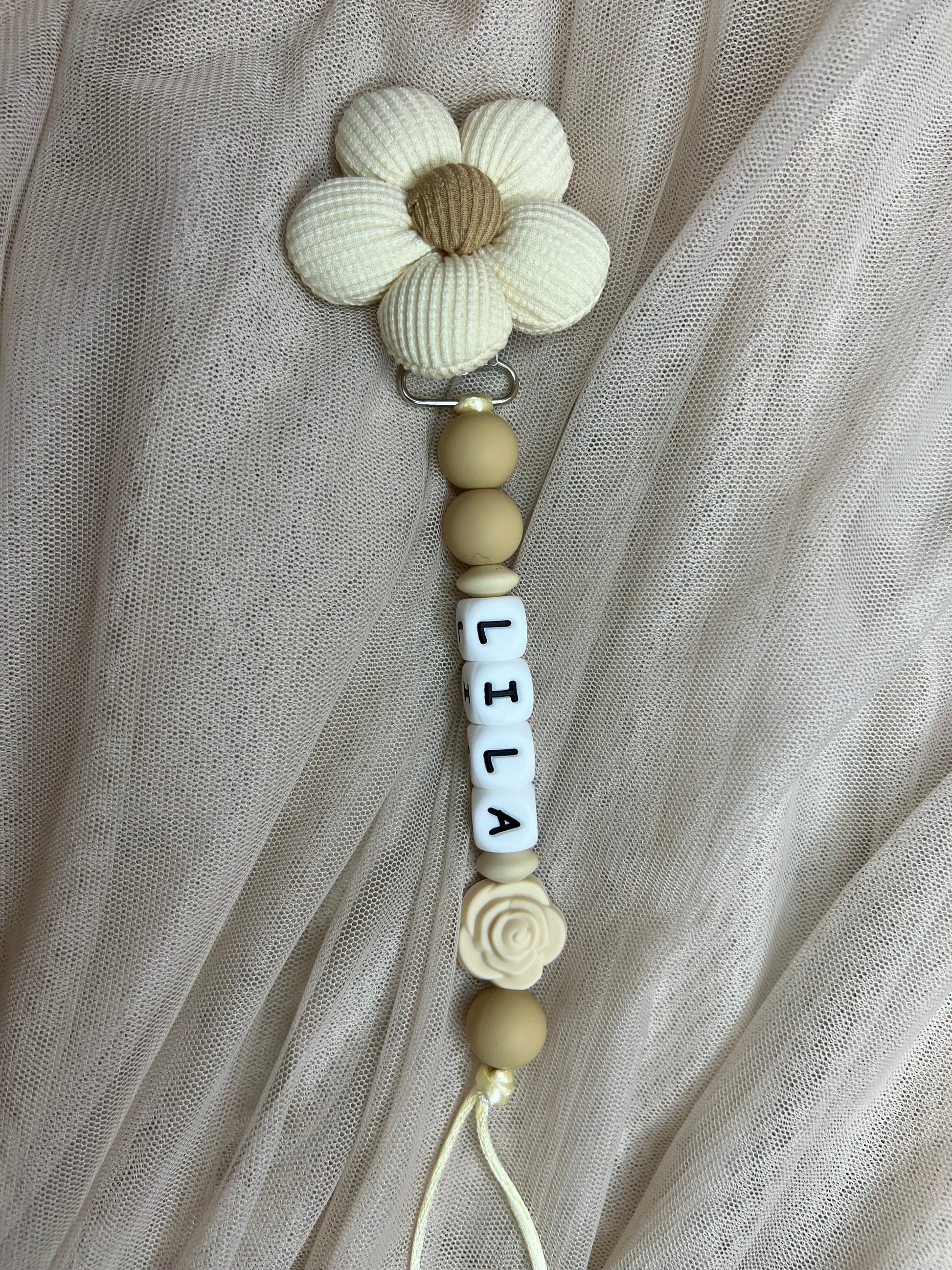 Attache tetine fleur en coton, avec perle marguerite ou rose.