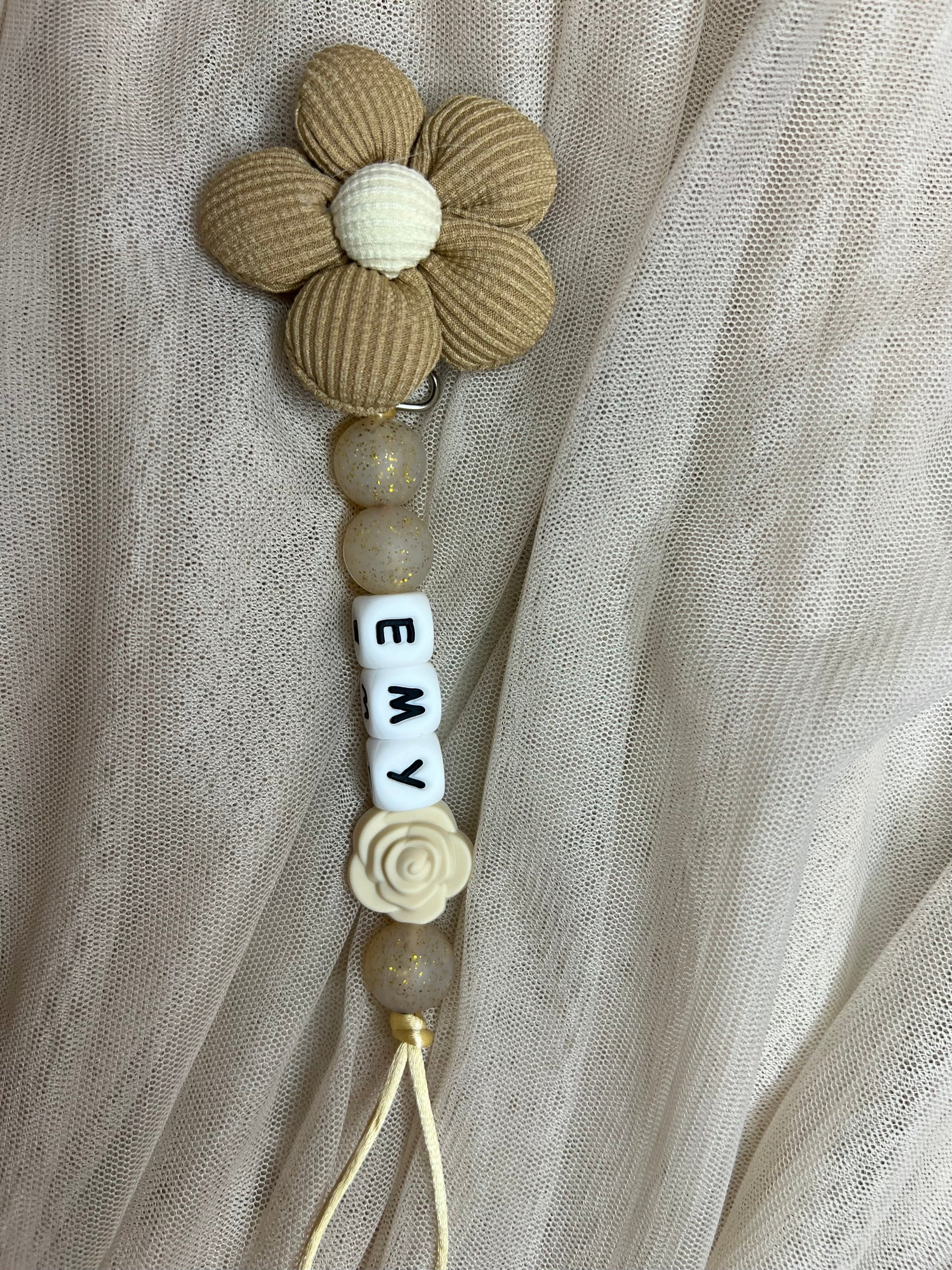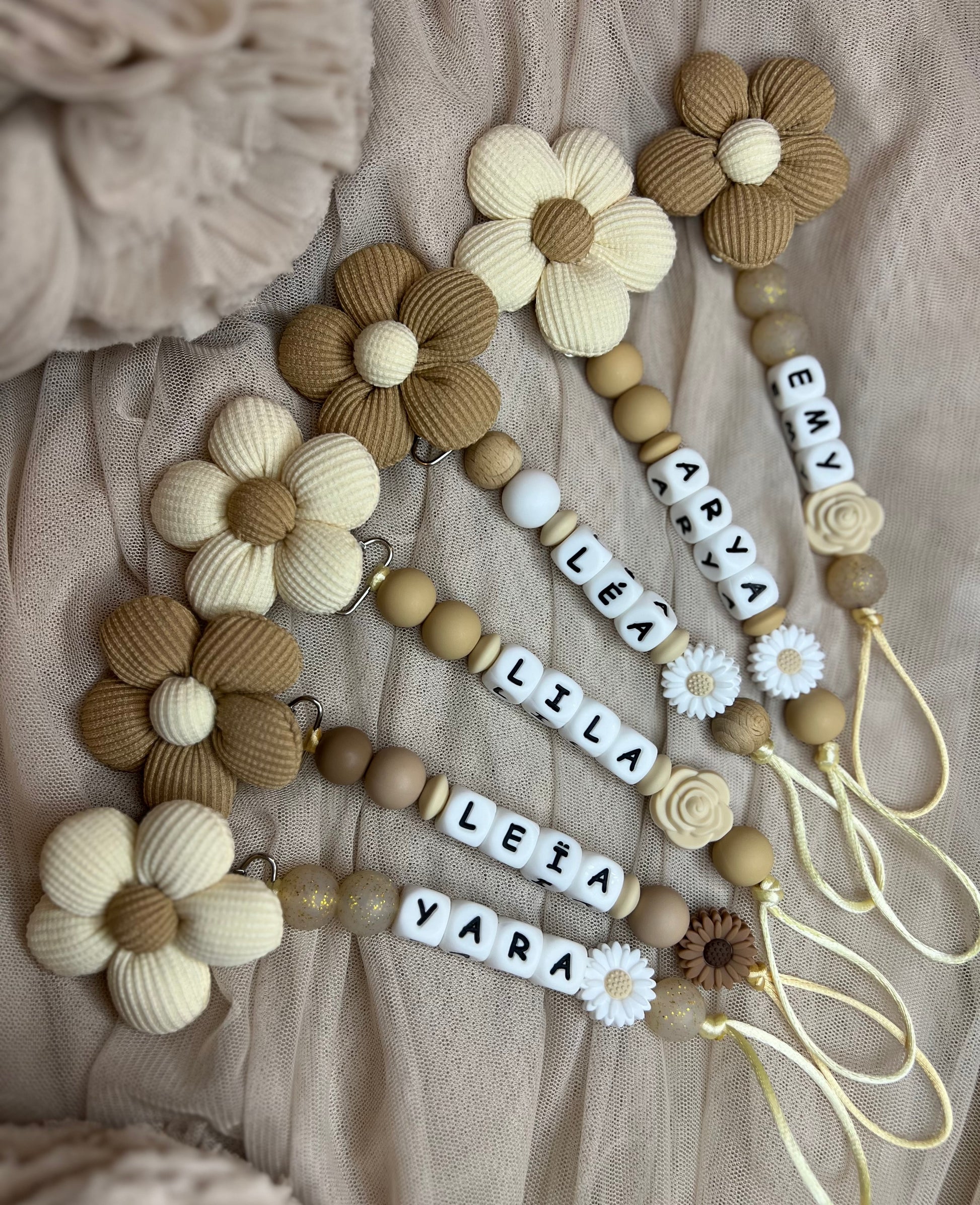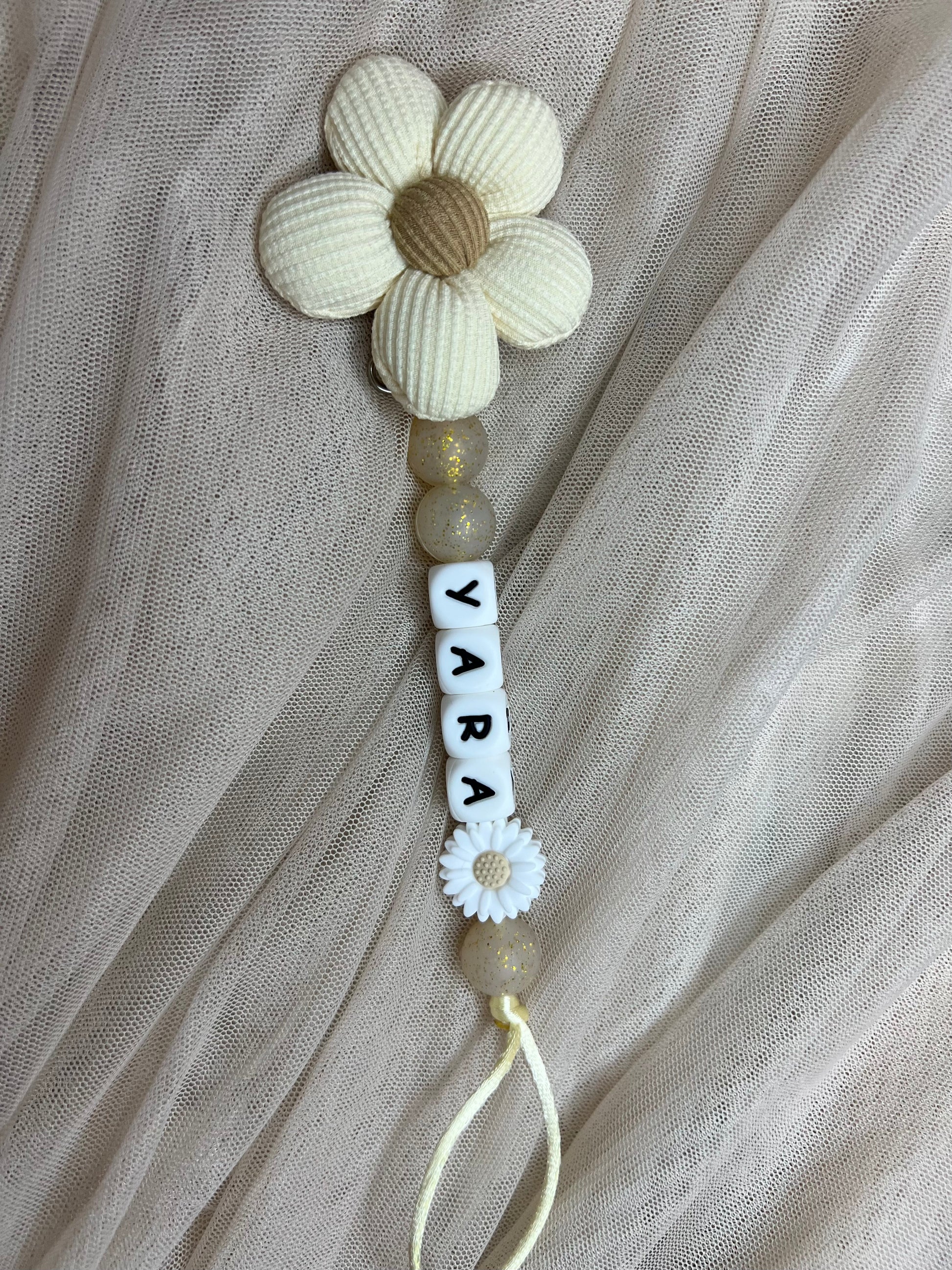 Attache tetine fleur en coton, avec perle marguerite ou rose.