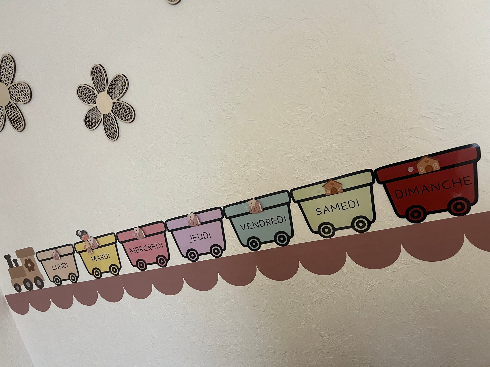 Le petit plus de ce petit train des jours de la semaine? Les jours d'école ou à la maison, et aussi 1 petit personnage représentant l’enfant qui se balade de jour en jour!